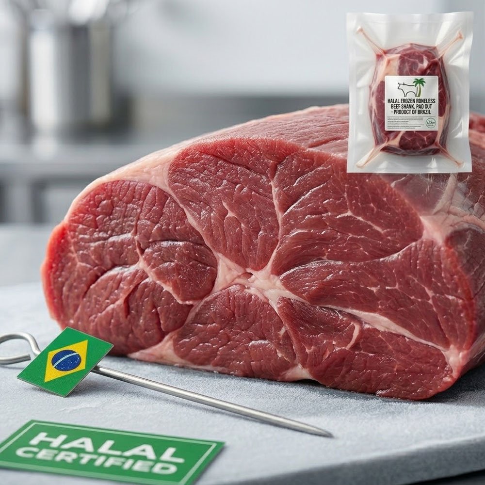 Our Halal Boneless Beef Shank Without Fat Cover (PAD) is supplied and exported from Brazil to international buyers seeking high-quality, halal-certified beef cuts for wholesale, foodservice, and industrial use. Each shank cut is carefully deboned, fat-trimmed (PAD), inspected, and frozen under strict halal supervision to ensure consistent quality, tenderness, and flavour.
